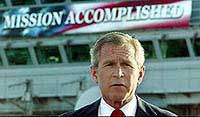 | President George W. Bush landed in a jet on the aircraft carrier USS Abraham Lincoln off the California coast and, in a speech to the nation, declared major combat in Iraq over. The banner his staff posted on the ship read, “Mission Accomplished.” |